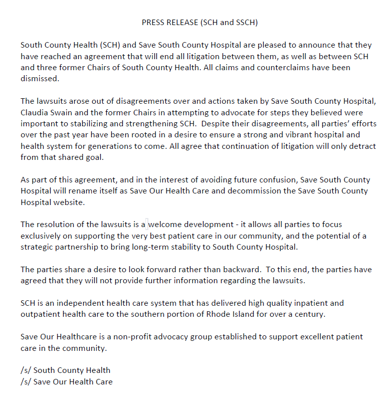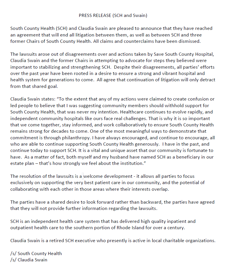 South County Health is pleased to share that the lawsuit involving the organization, the group formerly known as Save South County Hospital, three former Chairs of South County Health, and Claudia Swain has been resolved. Both sides have issued joint statements and are moving forward with a shared focus on supporting the health and well-being of our community.