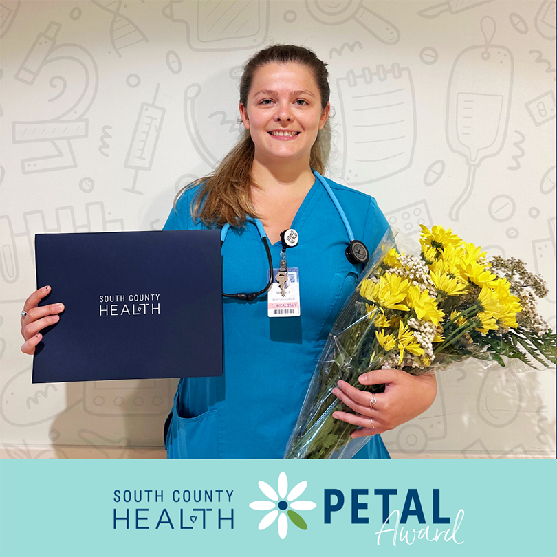 On Monday, August 7, South County Health Patient Care Technician Corrine Perrin was recognized with a Petal Award. Corrine was nominated by Susan DelFarno, RN, and Vanessa Schofield, RN.